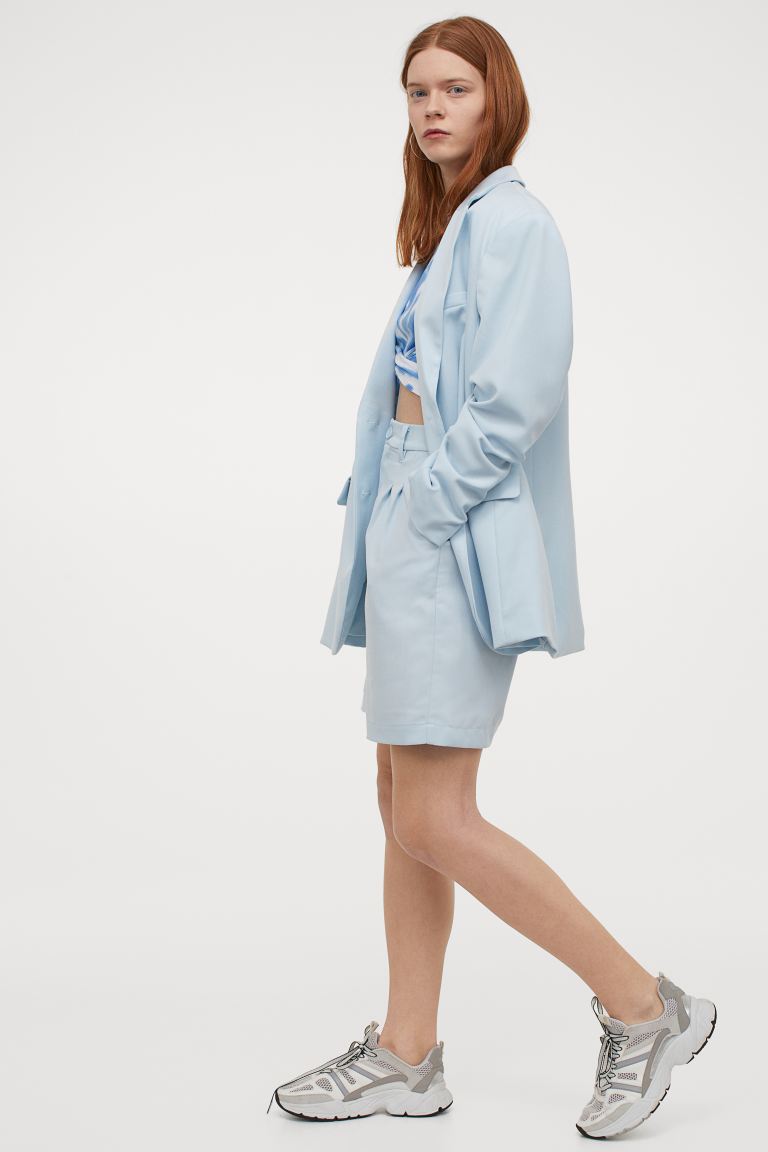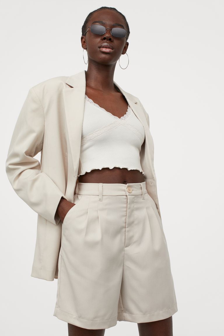 相比起 Zara 的款式,H&M 的百慕達短褲更為修身,採用了平織布料,上部有抓褶提升優雅感,配上高腰剪裁及備有有腰帶環,而腰後也有覆面鬆緊帶,以及有前袋和一個假後袋。除了黑色,還有淺藍及淺米色,很適合另外配搭西裝外套。