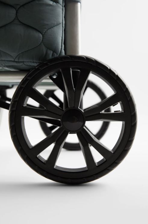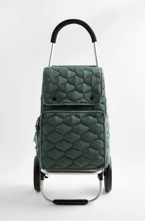 另一款「QUILTED SHOPPING TROLLEY(HKD 599)」則以傳統的手拉車為主,以絎縫為外形設計,裡面有抽繩內袋和磁扣的包蓋,有黑色、灰色和綠色3種顏色可選,用起來更為方便,備有手柄和大滾輪,在前方的底部也有防止滑走的設計。