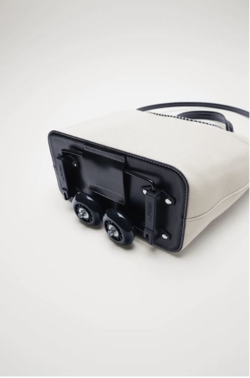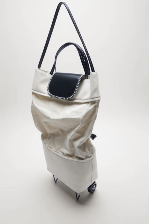 購物手拉車有兩個款式,第一款「SHOPPING TROLLEY TOTE(HKD 499)」以帆布 Tote Bag 為主,採用藍白配色,沒有手柄,但備有背帶,袋的底部設有滾輪,特別適合年輕媽媽,而且還可以拉開中間拉鍊,擴大袋的容量。